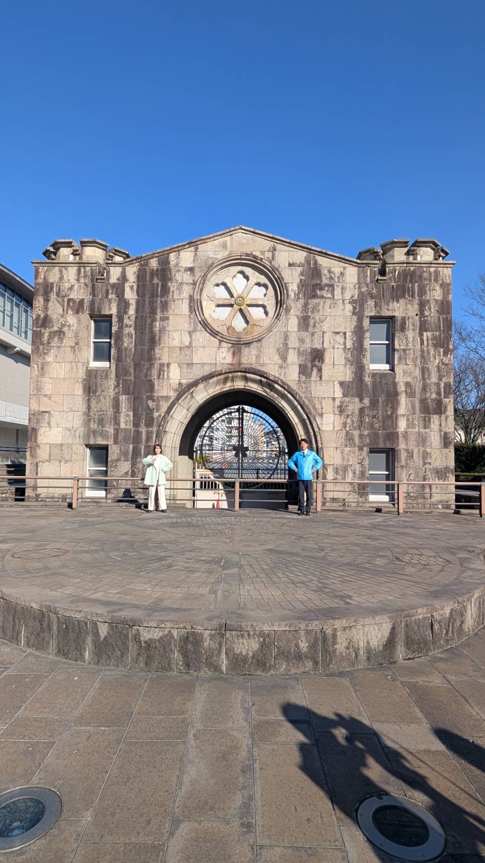 さっそく旧正門を見て回る二人。「一つひとつの石のゴツゴツした感じが伝わりますね!」と中島リポーター。中世の西洋を思わせるようなネオゴシック様式が特徴的です。旧正門の裏の方にも回って、表と裏の表情の違いを見るのもオススメですよ!明治時代にできた石造りの建物でありながら、とてもきれいに保存されています。門番のようなポーズをするなど、建物の雰囲気と合わせて撮影も楽しみました。石造りの建築物は、鹿児島市の史跡にたくさんあります。石をテーマに巡るドライブもいいですよね。さぁあなたも鹿児島市へ、「鹿児島らしさが残る建築物を見に行く」ドライブを楽しんでみませんか。